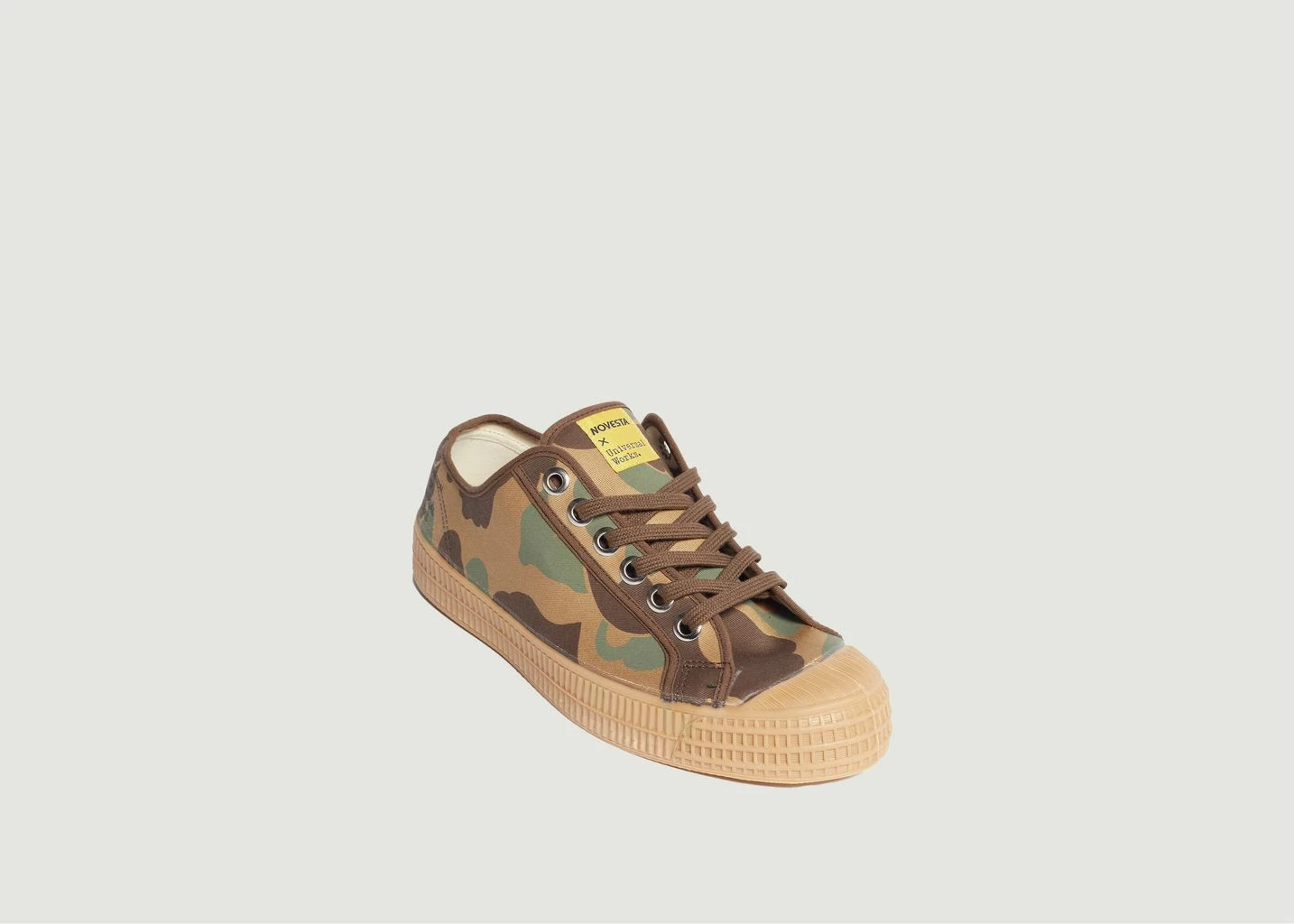 Cotton sneakers from the collaboration between Novesta and Universal Works • Sand color • Camouflage pattern • Thick rubber sole • Flat cotton laces • Rubber reinforcement on the toes