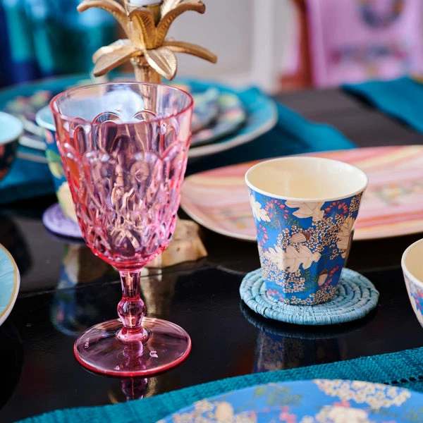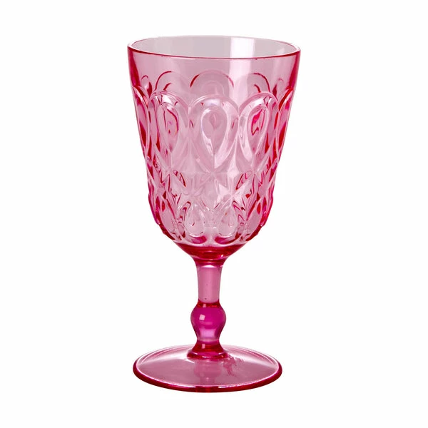 Acrylic Wine Glass in Pink. Large, retro-inspired wine glass in pink acrylic with swirly faceting. Decorative and eye-catching on any occasion and it is super convenient and practical both indoor and outdoor. Mix with our other acrylic products or your heirlooms from the display cabinet and add your unique and personal mark to the table arrangement. Size: H 17cm x Dia 9cm Care: This acrylic material is dishwasher safe… but if you want to keep the beautiful crystal look and a long-lasting durability, we highly recommend the glasses are washed by hand.