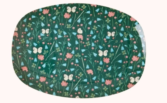 Un plato rectangular pequeño de melamina con dulces mariposas sobre un fondo verde. Perfecto para una porción de torta o unas tapas. Recuerda de ver nuestra gran colección de vajilla.