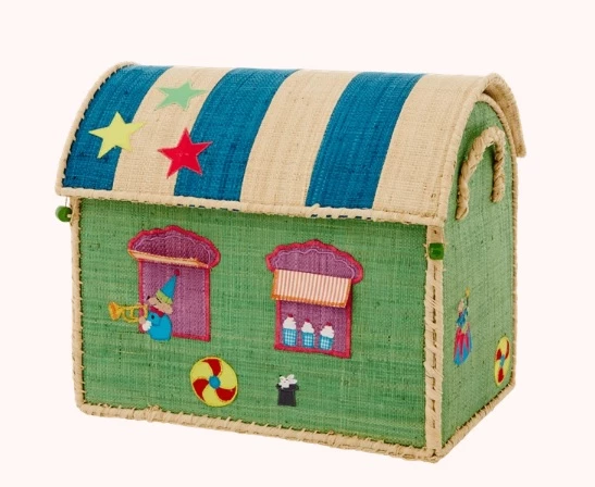 Preciosa cesta de almacenamiento de rafia hecha a mano. Es de tamaño pequeño y tiene bonitas decoraciones del tema de circo. Esta cesta para juguetes es perfecta para el almacenamiento de juguetes en la habitación de un niño y viene en diferentes tamaños. Úsalas para guardar juguetes, ropa o pequeñas cosas de lo cual no sabes que hacer – simplemente en esta cesta encuentras el mejor lugar para guardar cosas y rápidamente deshacerte del desorden.
